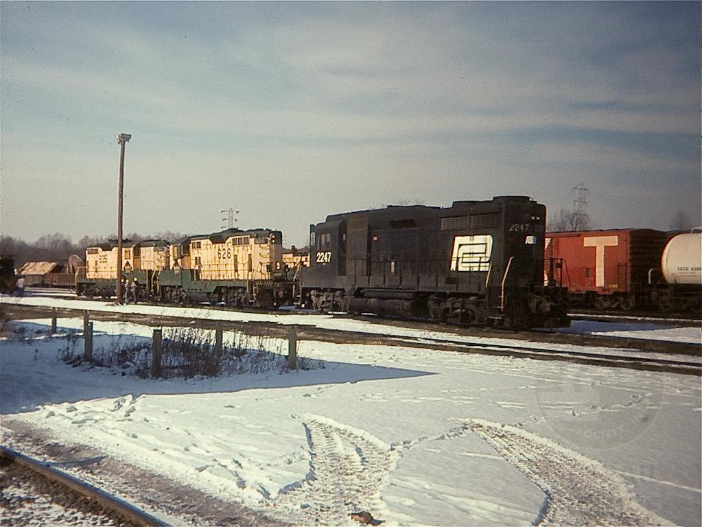 At the Abrams engine terminal in January, 1977, the yard crews for PC GP30 2247 and GP-7's 626 and 635 are gathered by unit 626.