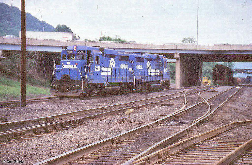Conrail GP30s 2249 (ex-PC 2249) and 2245 (ex-PC 2245) are seen at the west end of Enola Yard in 1983.