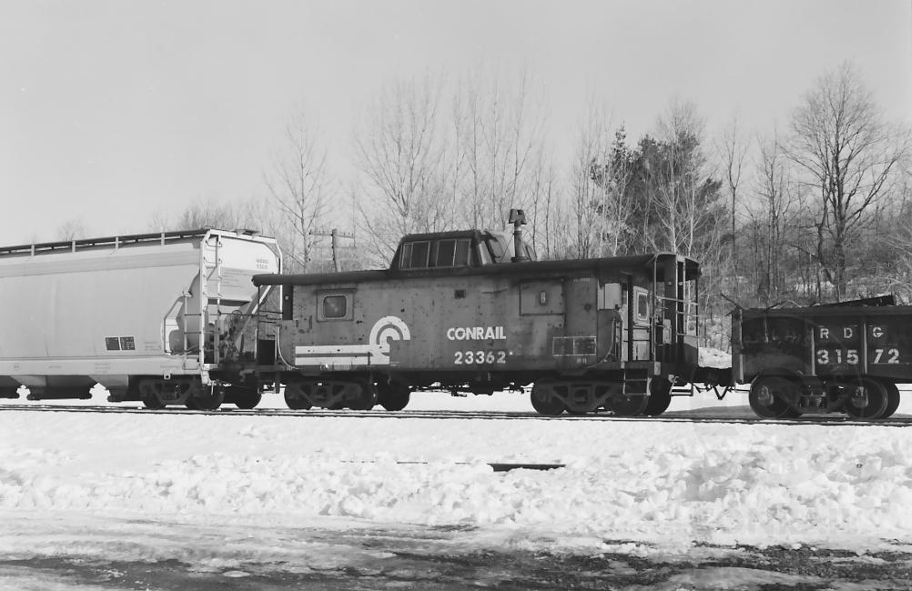 Ex PRR N8 23362 ensconced in MBSE traveling through Washington, MA. on New Year's eve, 1986. Of interest also, is that gon still sporting RDG reporting marks 10 years after CR startup.
