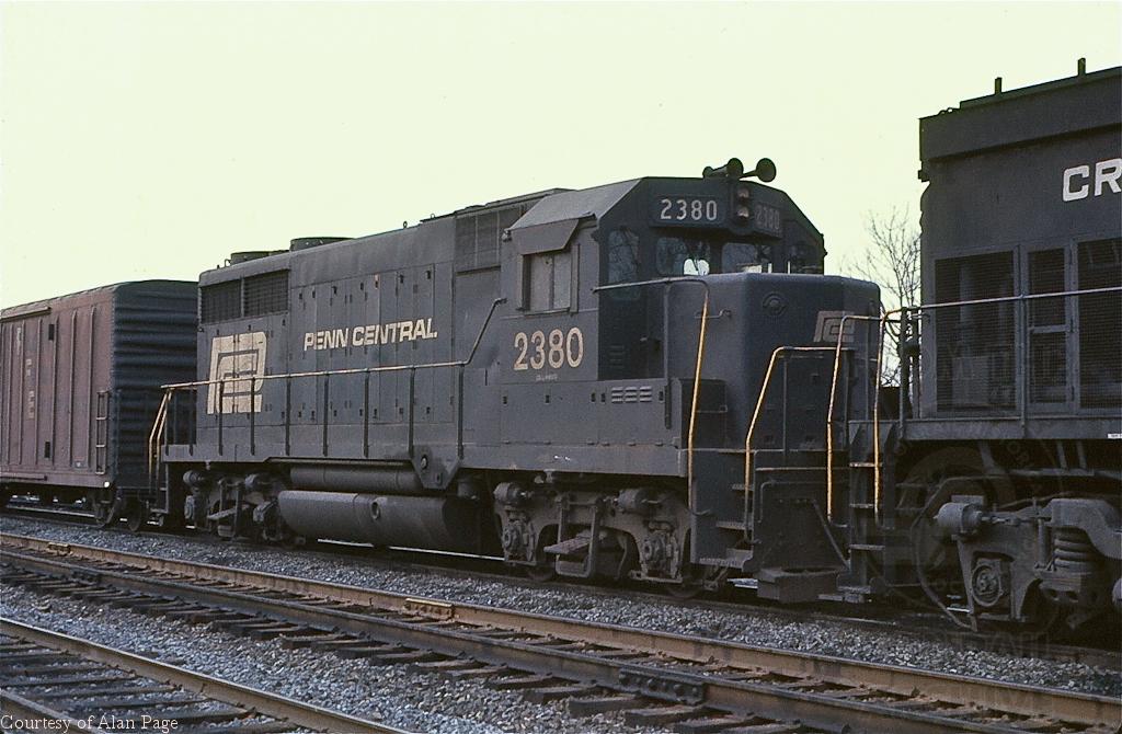 With a home base of "Collinwood" visible under the large PC number, GP-35 2380 follows Alco C636 6791 with a mixed freight through Abrams in February, 1977.