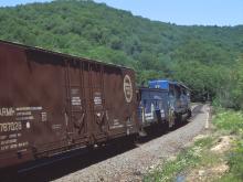 SD40-2 6432 is up against N10 van 24028 on the rear of RESE at MP 129 in Becket, MA. on July 1, 1982.