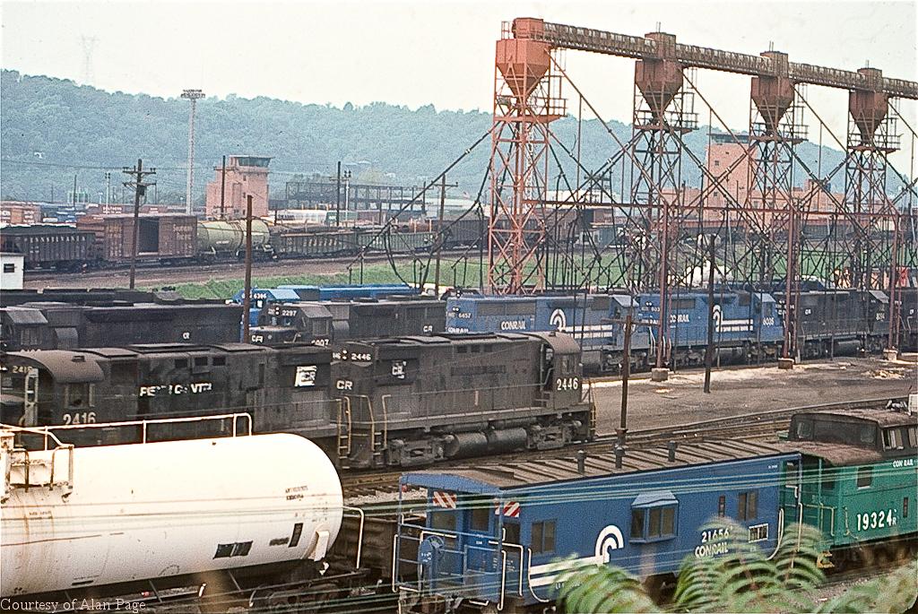 Two C425's pass by the massive lines of power at the Conway engine terminal in August, 1977. Numbered 2416 and 2446, these Alcos represent the first and last of the series of 31 ex-PRR C425's brought to Conrail.
