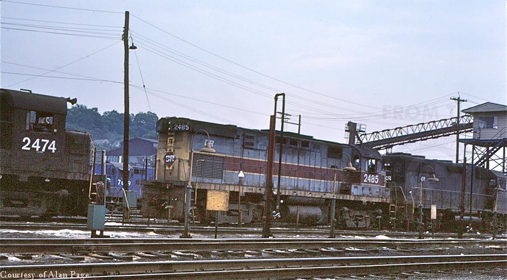 2474 and 2485 (ex-EL 2411) and GP38 7768 idle by the yard tower.