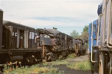 A wrecked ex-PC U25B rests between ancient SW-1 8591 and an Alco S-2 outside the Juniata shops in August, 1977.