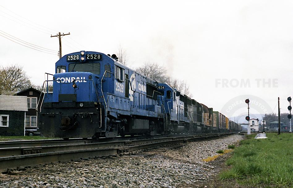 A Westbound to Buffalo departs Hornell. The signal to the far right is on the line from Meadville.