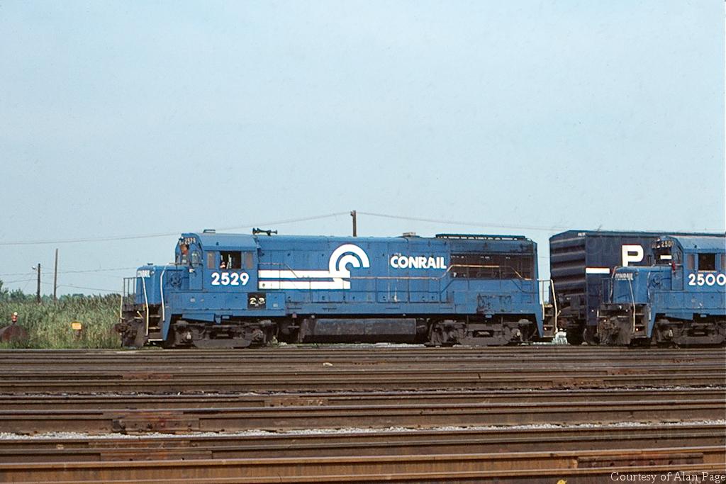 CR U25B 2529 rolls past sister-unit 2500 at Selkirk yard in August, 1979.