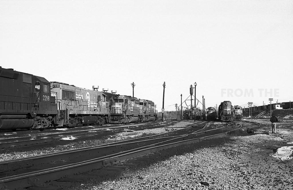 CR 2590 sits among several other Conrail engines at the Elkhart yard diesel pit on March 13, 1982. Note the hump yard is to the right side of the photo. Kevin notes that you couldn't get away with this nowadays. Kevin Nelson photo with permission