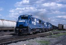 A trio of older power hustle an empty hopper train West on the Water Level Route.