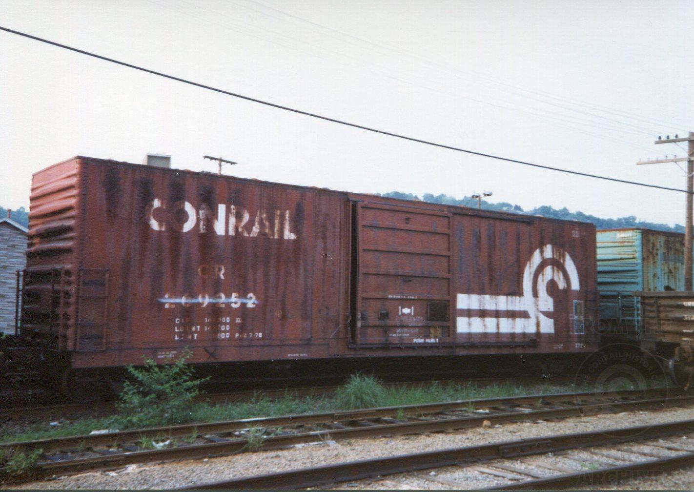CR 269252 Class X72 at Etna, PA on 06-13-1992. It was painted at the Hollidaysburg Car Shop in July 1978. July 1978 was the last month HCS applied the large logo to smooth side boxcars. During July 1978 normal sized logos started to be applied to smooth side boxcars.