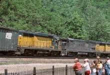 CR GP38 7866 leads CNW GP30 821, U23B 2742, and CNW GP-30 812 down Horseshoe Curve on May 22, 1977.