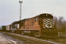 After switching duties, LV U23B 512 and PC GP-30 2238 are ready to pull out of Abrams with their mixed freight on a dark day in February, 1977.
