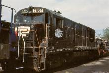 Still showing a NYC emblem, Selkirk-based former PC U30B 2855 awaits service outside the Juniata Locomotive shops in August, 1977.