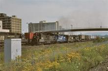In a quartet of all former PC power, GP40 3238 leads GP35 2296, U30B 2857 and GP38-2 8070 with a load of piggybacks through Altoona in August, 1977.
