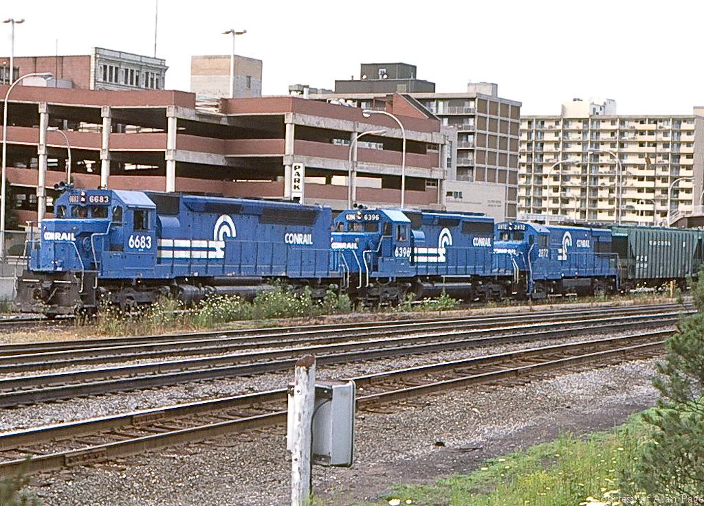 CR SDP-45 6683 (ex-EL 3652), SD-40-2 6396, and U33B 2872 roll a line of covered hoppers through Altoona in July, 1978.