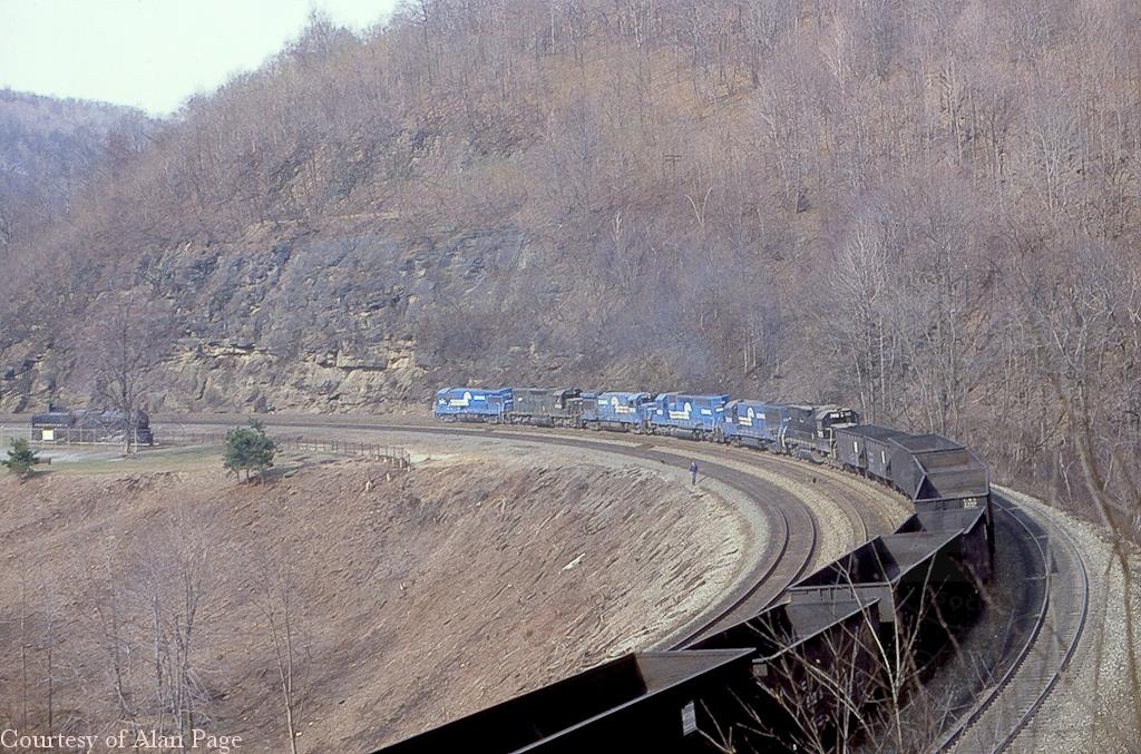 CR U33B 2916 leads an SD-35 (6039), U33B (2958), SD-40 (6293), U25B (2564), and a GP-38(7913) dragging empty hoppers up Horseshoe Curve in March, 1981.