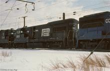 CR U25B 2652 leads ex-PC U33B 2931 and GP35 2264 under the catenary at Morrisville yard on a snowy March day in 1978.