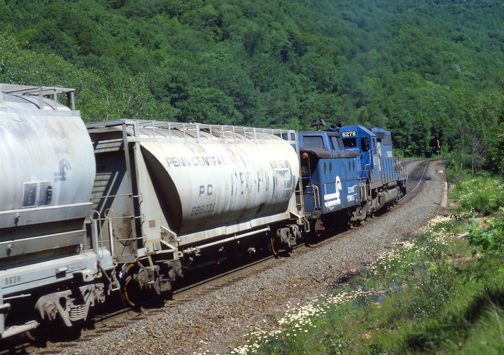 SD40 6278 shoving away on caboose 23110, an N5C, at the rear of NHSE past MP 129 in Becket, MA. on July 1, 1982.