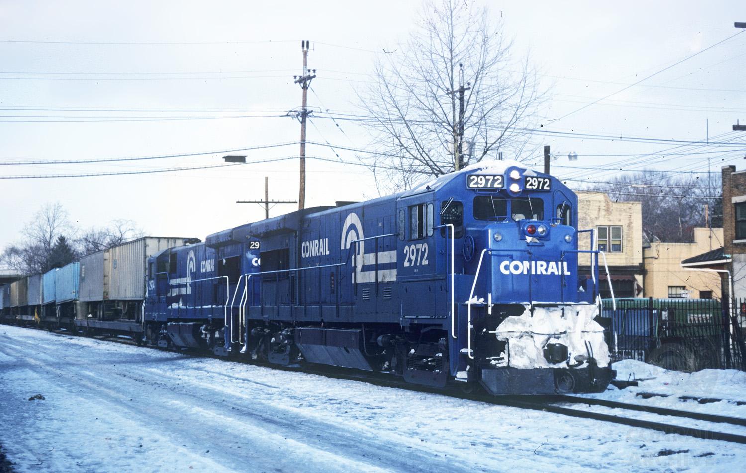Two of four exAutotrain U36b's hold in the siding at Bogota, NJ with TV-16