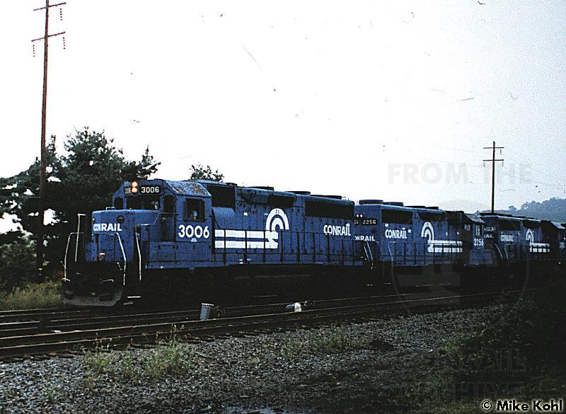 Conrail GP40 3006 is in charge of OIEN as it makes a pick-up at Hershey, PA on 9/7/1992