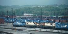A slew of retired power at Rose Yard in Altoona, PA includes Conrail GP35s 3624 (ex-RDG 3624), 3649 (ex-RDG 3649), and 3650 (ex-RDG 3650), as well as GP40 3007 (ex-PC 3007). Also stored are SW9s, GP9s, GP40s, SW1200s, and U23Bs.