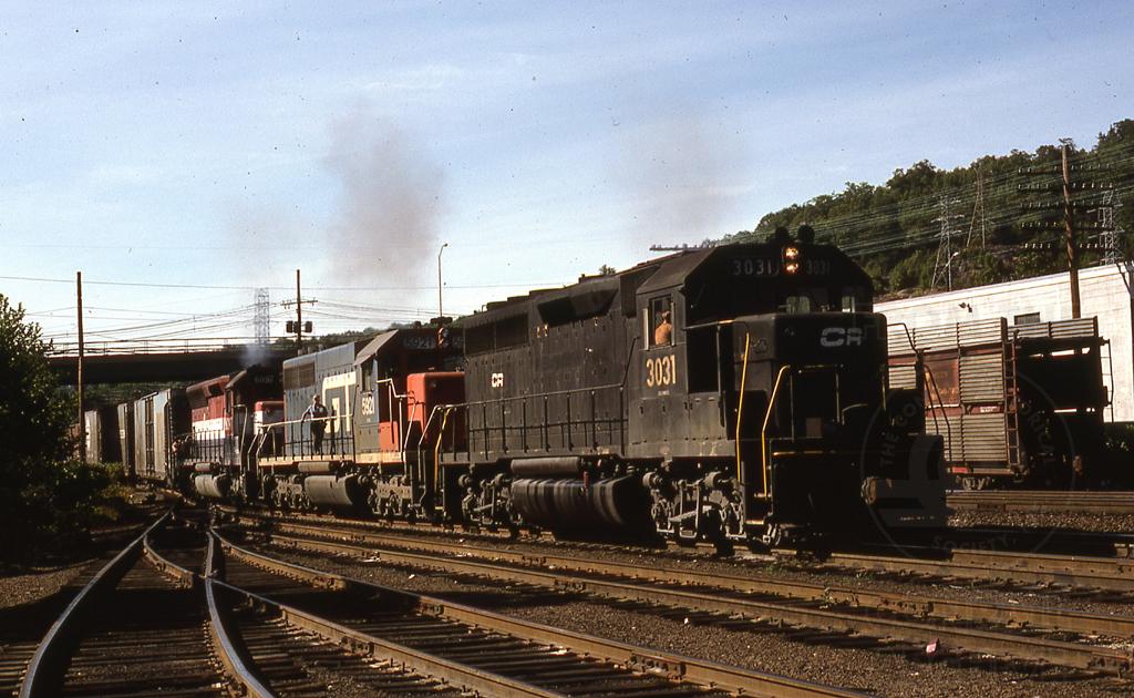 CR 3031, GTW 5921 & CR 6097, still in bicentenial paint, lead a Ford Extra at Suffern NY in Jult of 1977.