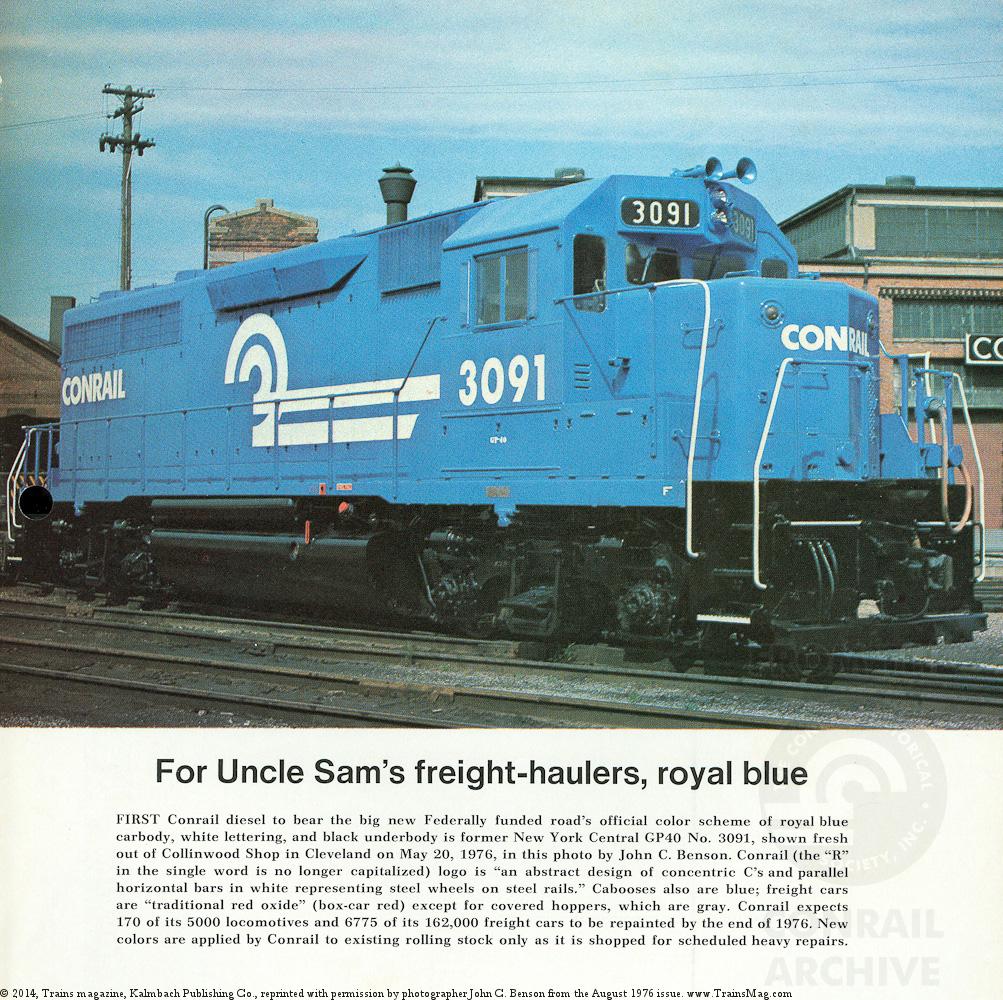 First Conrail diesel to bear the big new Federally funded road's official color scheme of royal blue carbody, white lettering, and black underbody is former NYC GP40 No. 3091 shown fresh out of Collinwood Shop in Cleveland on May 20, 1976, in this photo by John C. Benson.