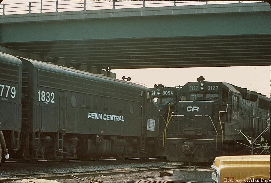 CR 1832 F-7A, coupled between a GP-38-2 and a sister unit, waits for action under the highway overpass in Binghamton, NY. CR GP-40 3127 waits alongside.