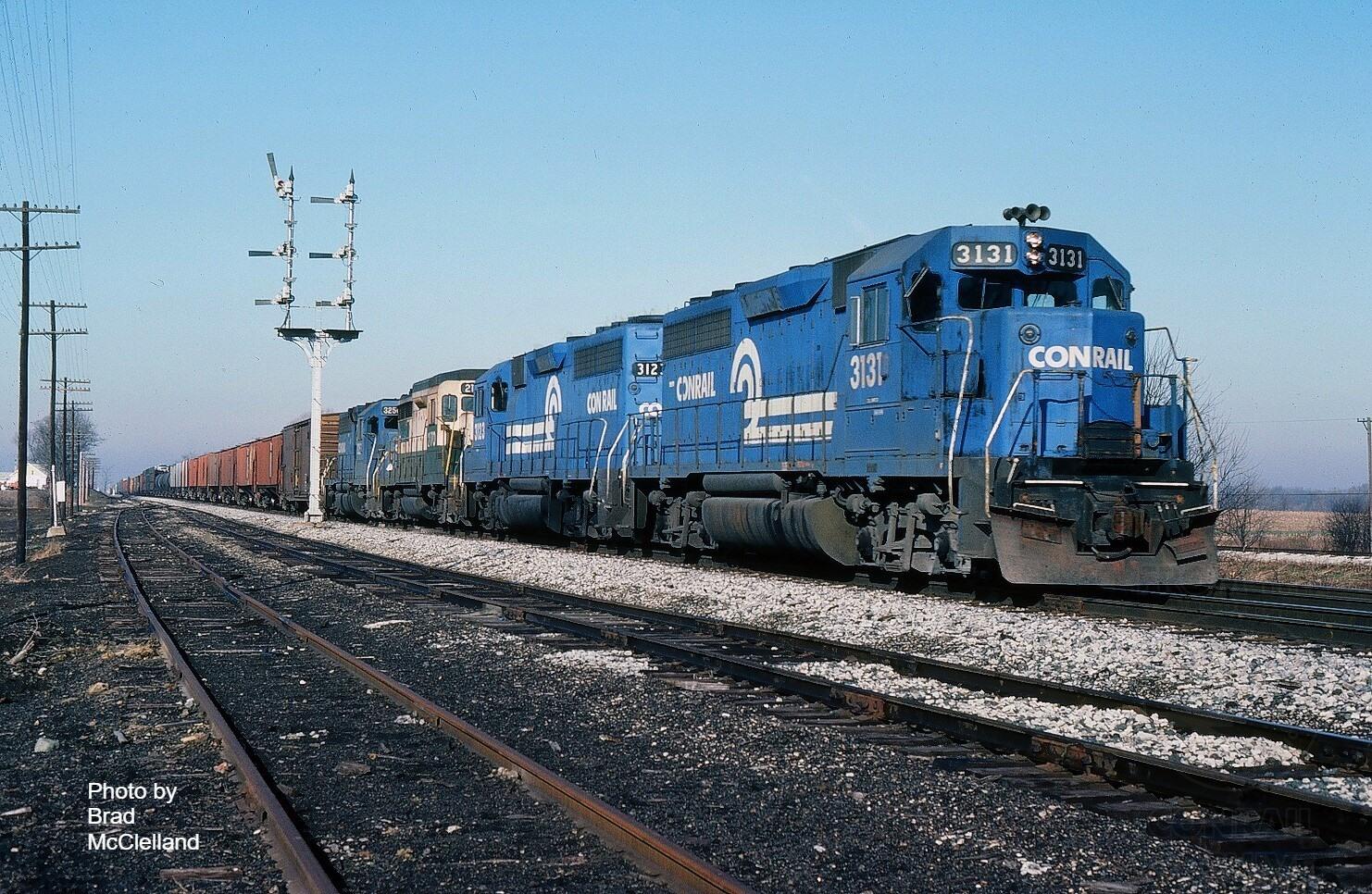 In the morning of March 13, 1983, eastbound INPI-3 passing the home signal for Morgan Tower in Quincy, Ohio. Morgan Tower guarded the crossing of Conrail's Indianapolis Line with DT&I's main between Lima and Springfield. The two tracks at the left were the interchange between the two railroads.