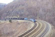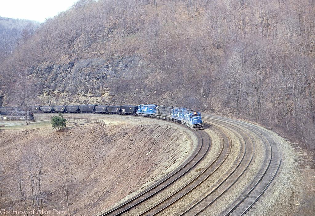 CR 3167 GP-40 leads GP-30 2194 and two other black and blue EMD SD's down Horseshoe Curve in March, 1981.