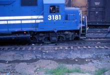 "Port Richmond, We Have A Problem" GP40 3181 split a switch and its front truck is on the ground. Near "A" St. & Lehigh Ave. in Philadelphia, PA. 1978.