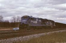 Former PC U33B 2964 leads GP-40 3194 through Spruce Creek, PA in November, 1980.