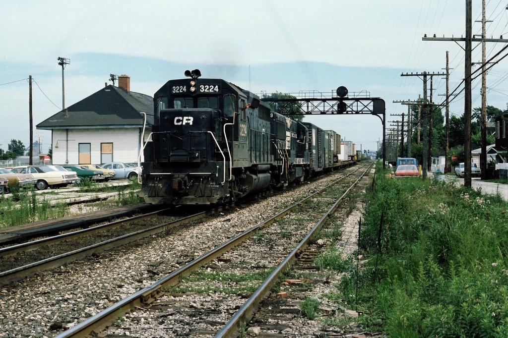 A westbound Conrail freight with GP40 3224 on the point on the Fort Wayne Line passes the former PRR depot at Whiting, IN, in August 1977. Doug Davidson photo with permission