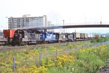 CR GP40 3238 leads GP35 2296, U30B 2857 and GP38-2 8070 with a load of piggybacks through Altoona in August, 1977.