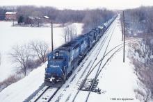 CR 3248 GP40 leads on eastbound freight on the Buffalo Line. The unoccupied track is Fair Siding. The siding leading into the woods went to a coal grinding facility, long since shut down.