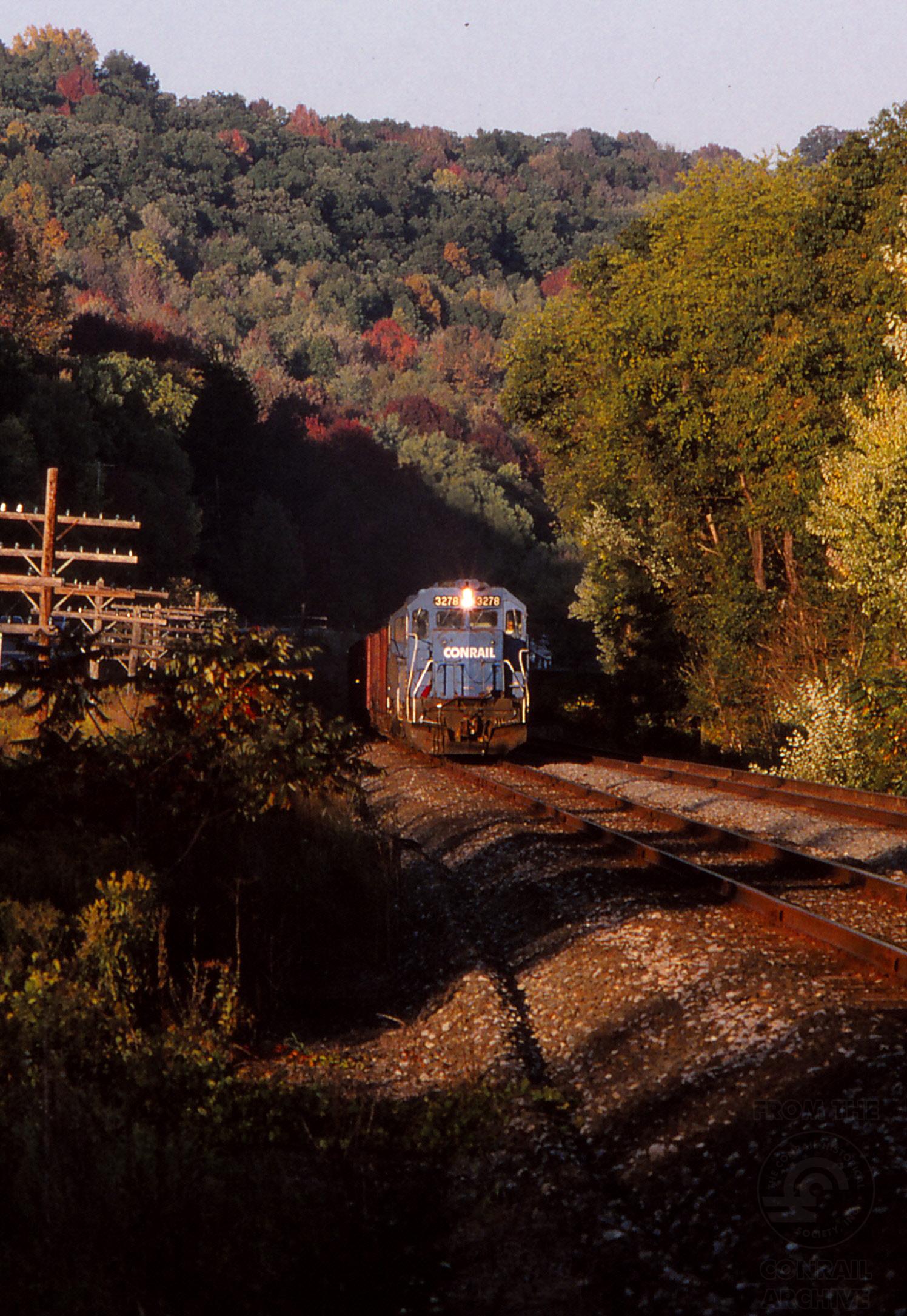 An empty UNG train rolls out of the shadows and into the late afternoon sun at MP 231 between Campville and Owego.