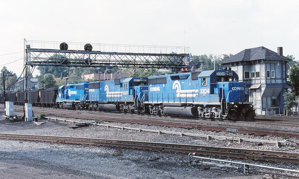 CR 3304, 6857 & 3335 are seen leading a EB loaded PPLX coal train past ALTO tower in Altoona PA on 10/5/97.