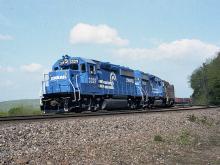 Brand new GP-40-2's 3329 & 3328 are on the point of an Eastbound freight as it starts into Horseshoe Curve.