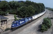 A Roadrailer train heads west past the former PRR Sewickley station. This train originated in Rutherford, Pa near Harrisburg, no stranger to the 2nd unit, CR 3277, the ex Reading 3673.