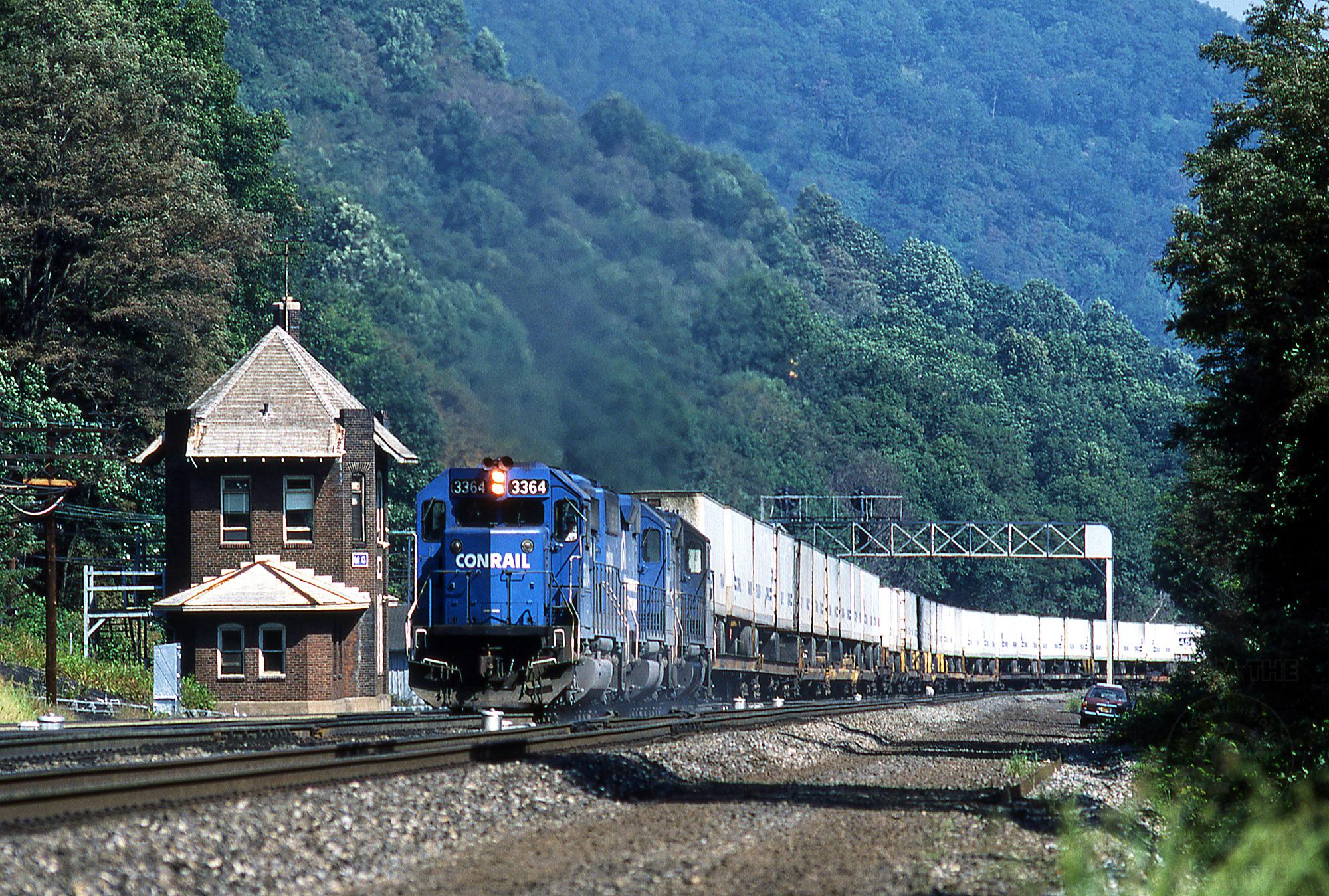 WB TV Train passing MG Tower w/ GP40-2 No. 3364 and two other units. MG Tower, PA. 9/8/84