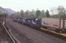 Conrail GP40-2s 3367 and 3326 are assisting an eastbound TV train through CP-MG in 1981. The quartet of GP40-2s and the old Trailvan make this a classic Conrail shot.