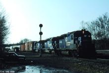 A GP40-2 brings Conway-Oak Island manifest train PIOI through CP-BURN on November 15, 1992. PIOI is not working in Allentown, as evidenced by the fact that the train is using the "bypass" via East Penn Jct. to get to Bethlehem.
