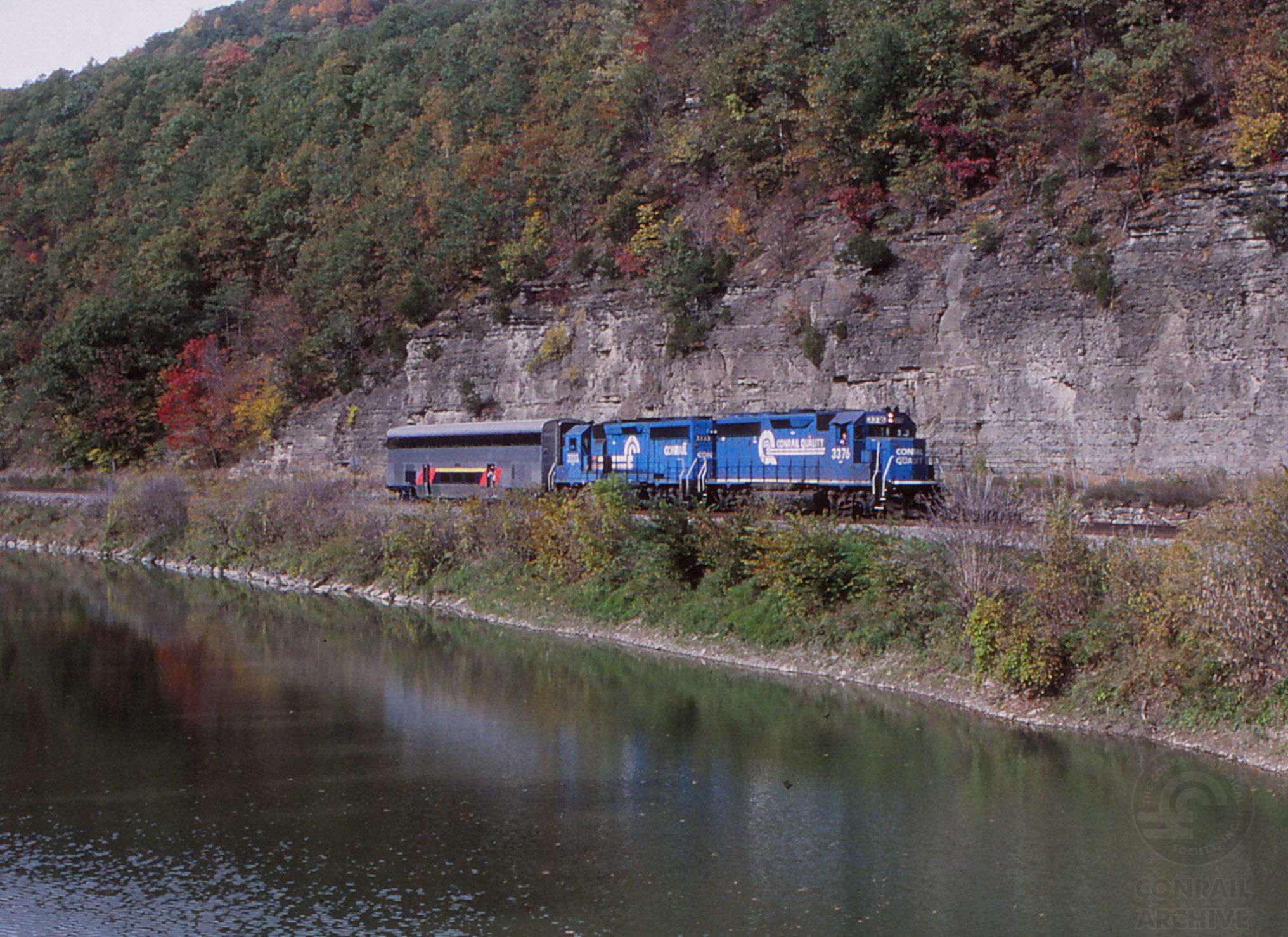 An SPL symbol rolls along the Canisteo River with a single bilevel coach from Hornell.