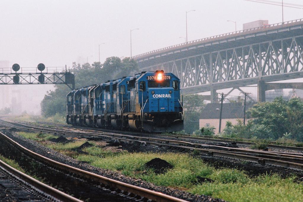 Conrail light power move, led by GP40-2 3378, on the Chicago Line is approaching the Calumet River bridge in September 1981. You can really see how the Chicago Skyway paralleled the mainline at this point. Doug Davidson photo with permission