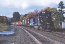 Helper SD40 6348 tags along on the rear of the X3388 through Hinsdale center. Evidently, he's going to Pittsfield to wait for an eastbound.