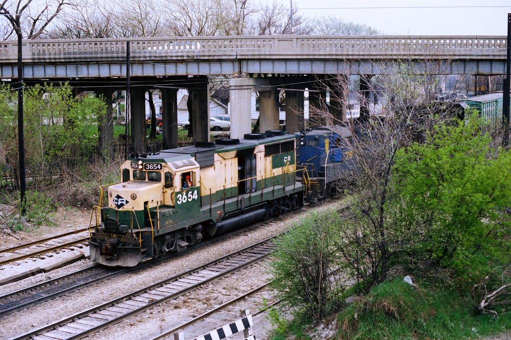 Conrail westbound freight on the IHB at LaGrange, IL behind GP35 No. 3654 in Reading paint and leased Bangor and Aroostook GP9 No. 79, in April 1979. Doug Davidson photo with permission