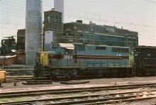 CR GP35 3664 (ex-EL 2558) and ex-PC SD45 6141 blast by the Harrisburg engine terminal with freight in June 1977.