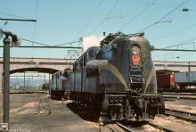 CR GP35 3664 (ex-EL 2558) and ex-PC SD45 6141 roll past PRR GG-1 4935 at the Harrisburg engine terminal in June, 1977.
