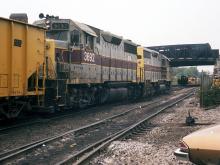 A couple of ex EL GP-35s are on a ballast train. The track work is in progress on the other side of the bridge.