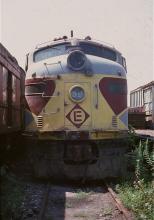 EL E-8A 813 shows damage as the ex-Lackawanna E-unit rests retired a few rows in at the Juniata shops deadline in August, 1977.
