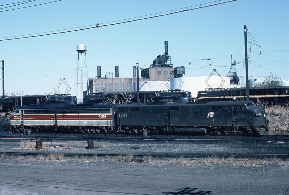 CR E8A 4014 & PC E7A 4244 are seen at S. Amboy NJ in 7-77.